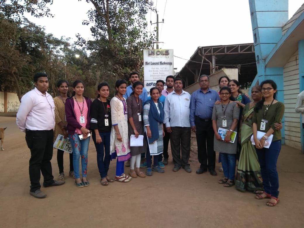 The group of  final year B.Com  students and teachers visited the Laxmi Narayan Oil Mills at hubli  on 11th sept, 2018. The visit was a part of the experiential learning  and understanding the production process in a oil mill. The Laxmi Narayan Solvents, Hubli a unit for extraction of edible oil from cotton seeds owned by Mr. Manuel and his partners. The students learnt the process involved in the oil extraction and also had a great idea of the By-products and the waste product , which after further processing have got a great commercial value. The Unit has an annual turnover of approximately Rs. 300 crores and employs around 200 regular and about 300 seasonal workers in the unit.