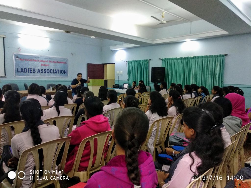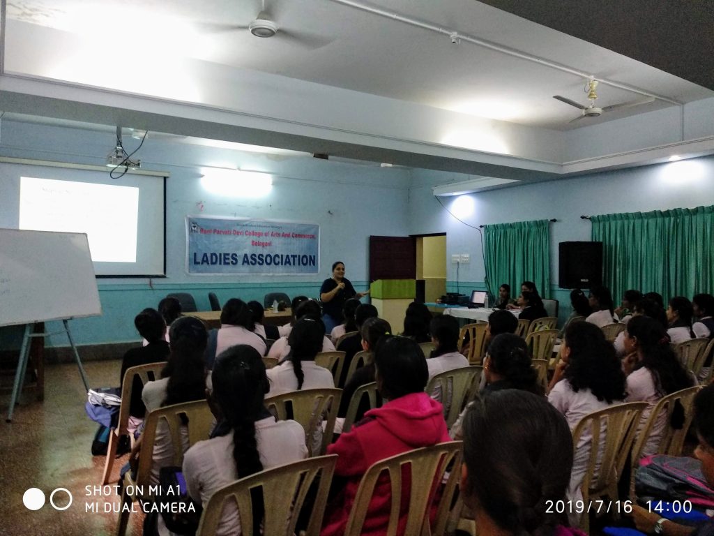 The activities of Ladies Association for the current year were formally inaugurated on 16th July 2019. On this occasion Dr. Chetali Khadye, renowned physiotherapist from Mumbai was invited to conduct a seminar on the topic “Greeting the woman in me” for girl students of final year BA & BCom. Ladies Representative Ms. Vani Chinnappagoudar welcomed the gathering Cultural Secretary Ms. Sanjana Powar introduced the guests.