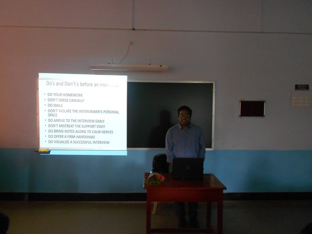 A seminar on the topic “Building a Vibrant Career” was conducted by Sri.Akshay M Mahajan for the BBA final year students. Visually challenged since birth Mr.Akshay holds MBA degree holder. He made ppt presentations by using his laptop on two separate subjects. “Crafting an effective resume’ and ” Facing the Interview Battle”. His talk was well received by the students. During Q & A session Robin, Amar and other students got their doubts cleared. All the participants expressed happiness over the conduct of both sessions by Akshay Mahajan, who had participated in International conference on United Conventions of Rights of Persons with disability held in Delhi during 2013.