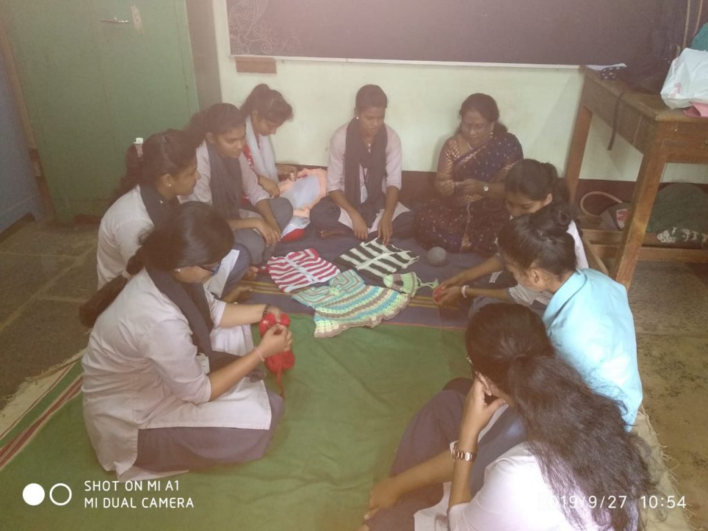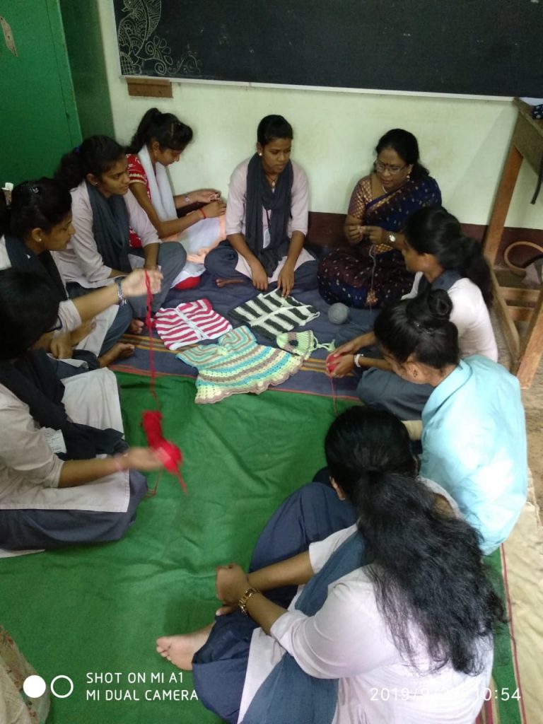 hobby centre organised knitting classes for students after 12.00 pm. smt. Geeta Sutar gave demonstration on knitting different patterns using woollen threads.
