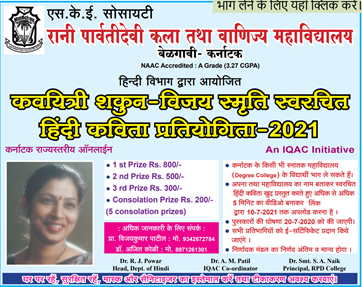 A brief report of the activity : Hindi Dept. of RPD College organises Shakun Vijay self-composedhindi poetry recitation competition every year in the memory of hindi poetess Late Smt. Shakuntala Heda. The competition is sponsored by the Heda family.In the view of Covid-19, the competition was conducted online. Total 11 Prizes (Amount Rs. 3200/-) were given. Dr. Jaishankar Yadav, Dr. Smt. Neelu Barigidad and Prof. Smt.Vishalakshi Patil were judges. 27 students participated in the competition.