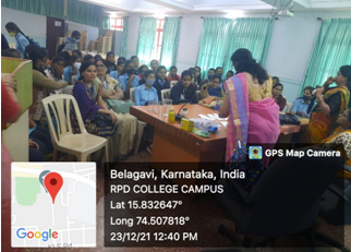 A brief report of the activity : On behalf women empower wing a special guest lecture was arranged on 23-12-2021 on ‘Menstrual Hygiene’for creating awareness about uterus cancer and use of biodegradable pads. The resource person the occasion as Mrs Anusha Asolkar from Mumbai who is conducting this programme from last 5 years in Maharashtra, Goa and Karnataka.